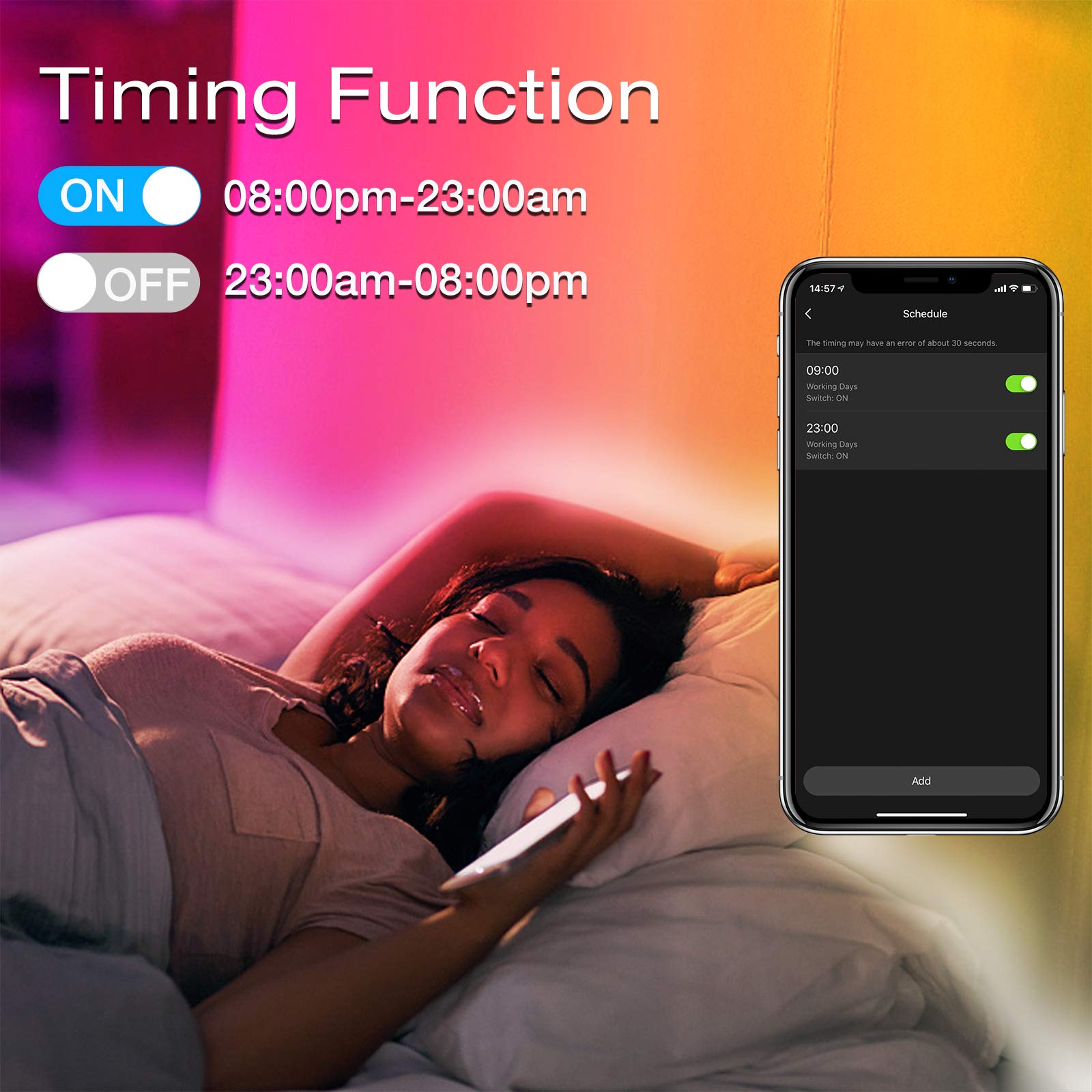 Timer & schedule : You can schedule the smart led strip automatically switch on/off via your phone app; And you also can set a countdown timer; Set the wifi led lights turn on or off at a specific time; Turn all lights on the moment you back home, turn all lights off when you are away from home