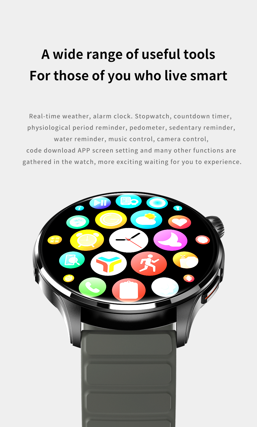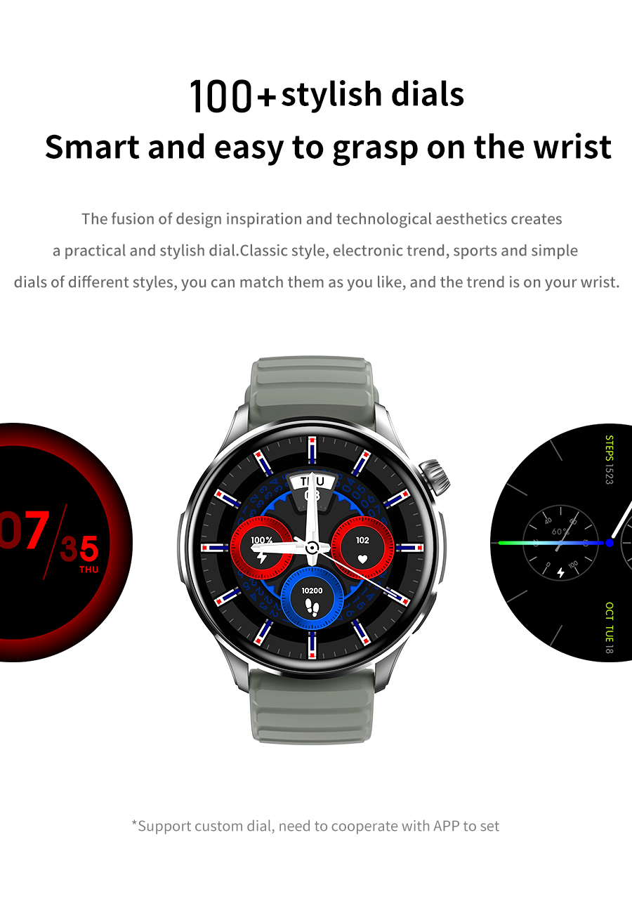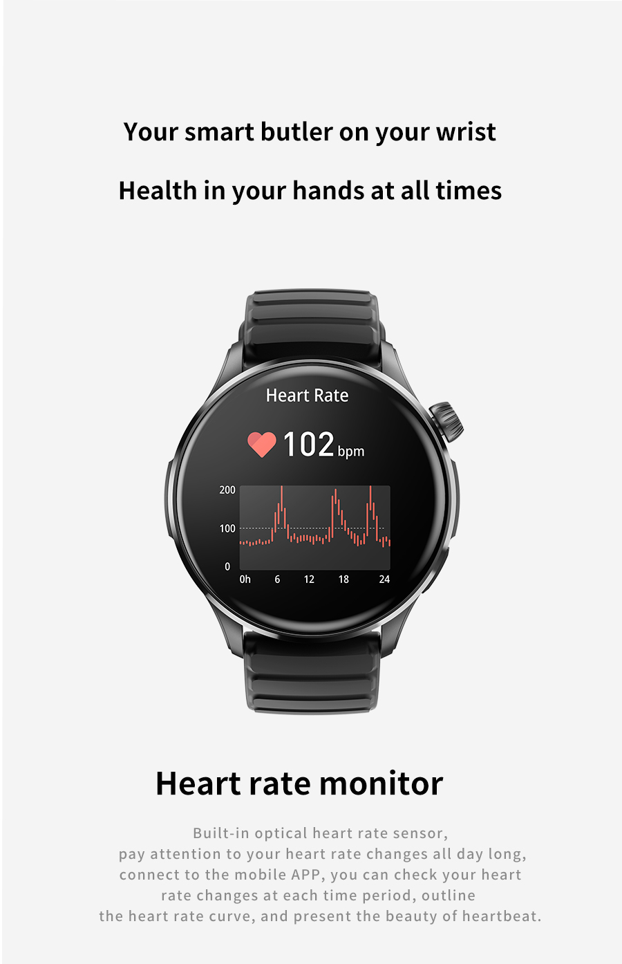 | Basic Functions | Bluetooth calling,Heart rate,Blood Pressure,Blood oxygen,AI Voice ,100+Sport modes,ETC. |