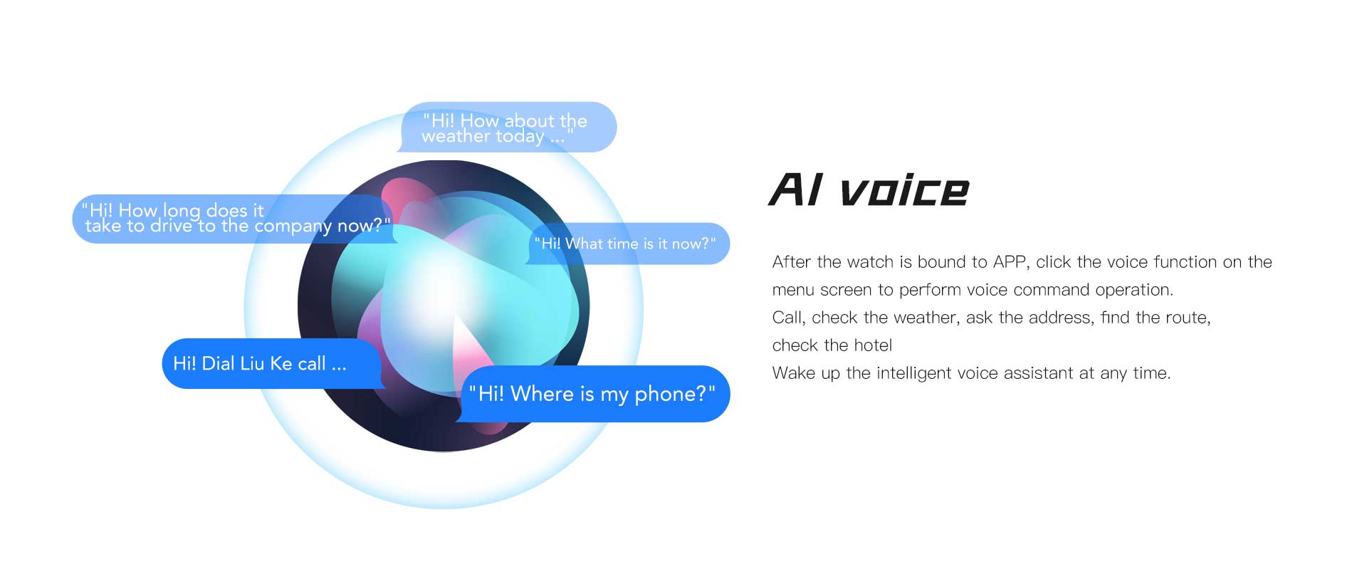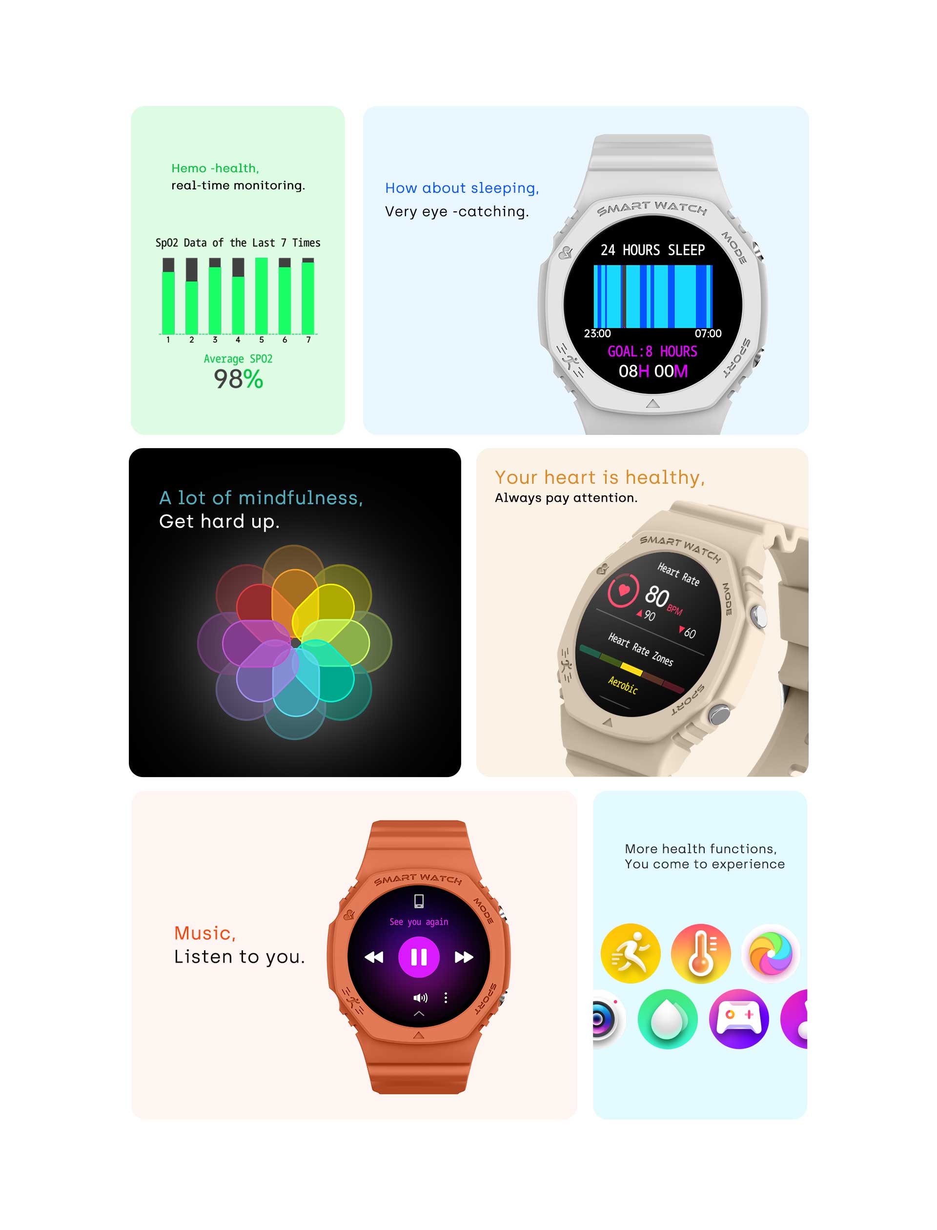 | Basic Functions | Bluetooth calling,Heart rate,Blood Pressure,Blood oxygen,AI Voice ,120+Sport modes,ETC. |