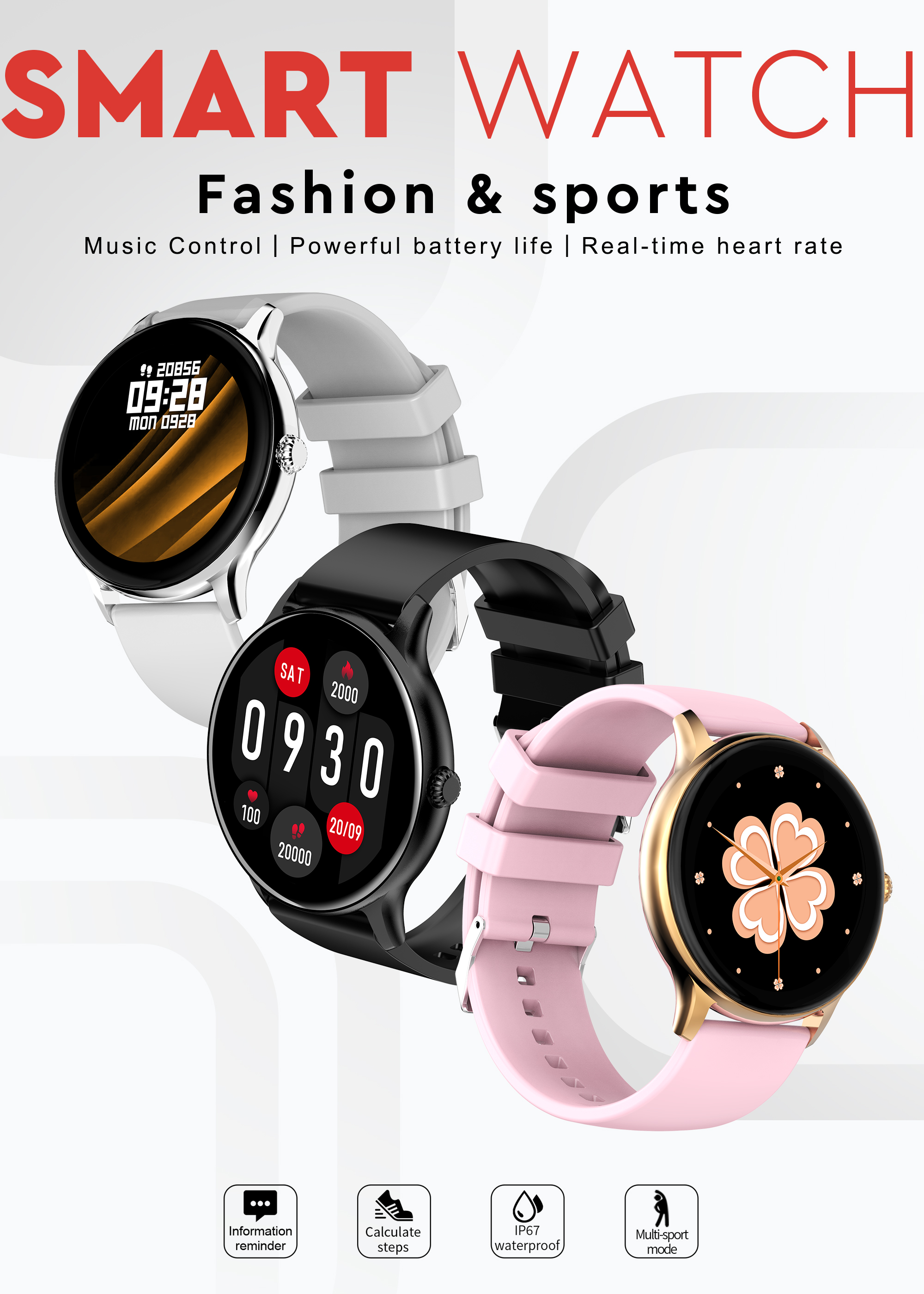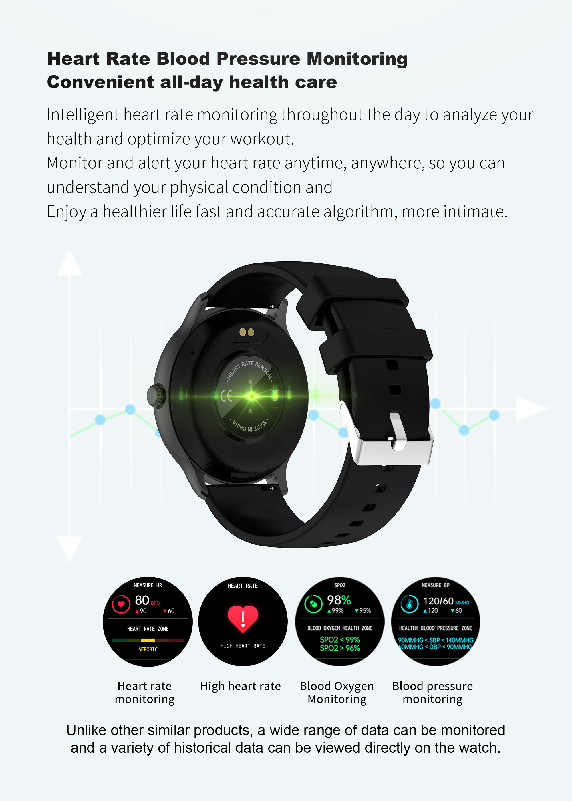 | Basic Functions | Bluetooth calling,Heart rate,Blood Pressure,Blood oxygen,AI Voice ,100+Sport modes,ETC. |