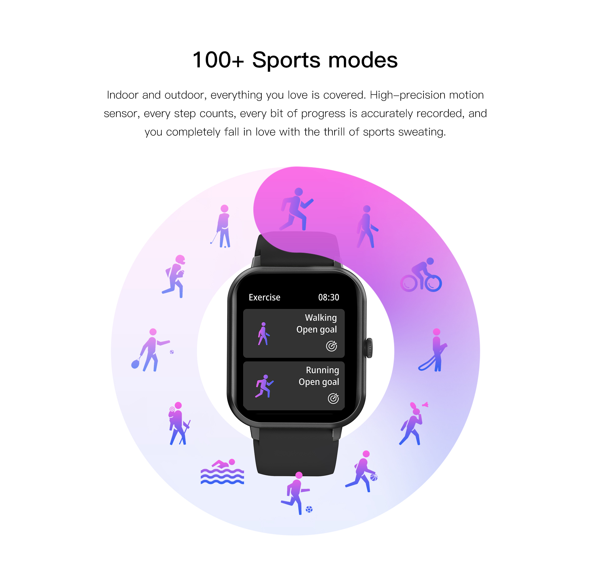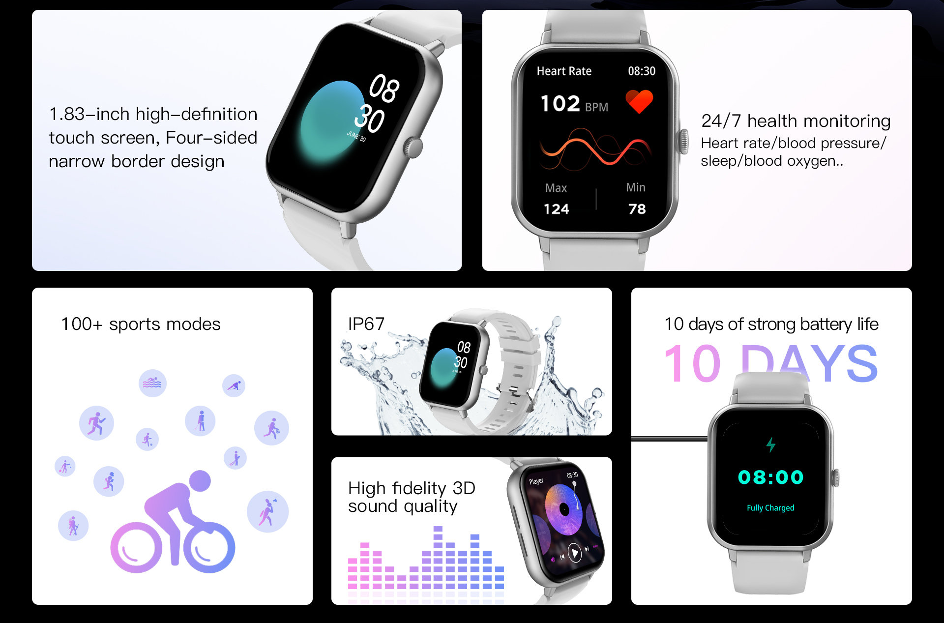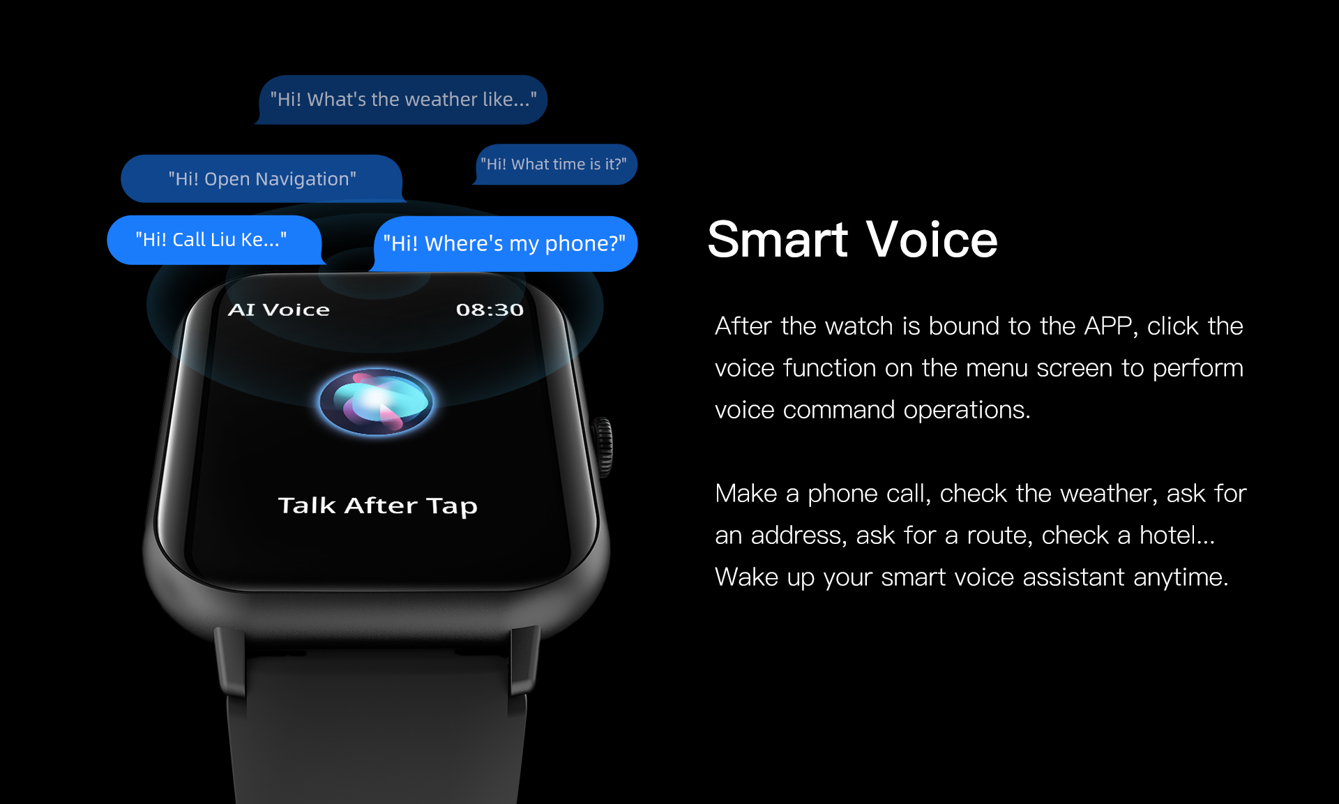 | Basic Functions | Bluetooth calling,Heart rate,Blood Pressure,Blood oxygen,AI Voice ,100+Sport modes,ETC. |