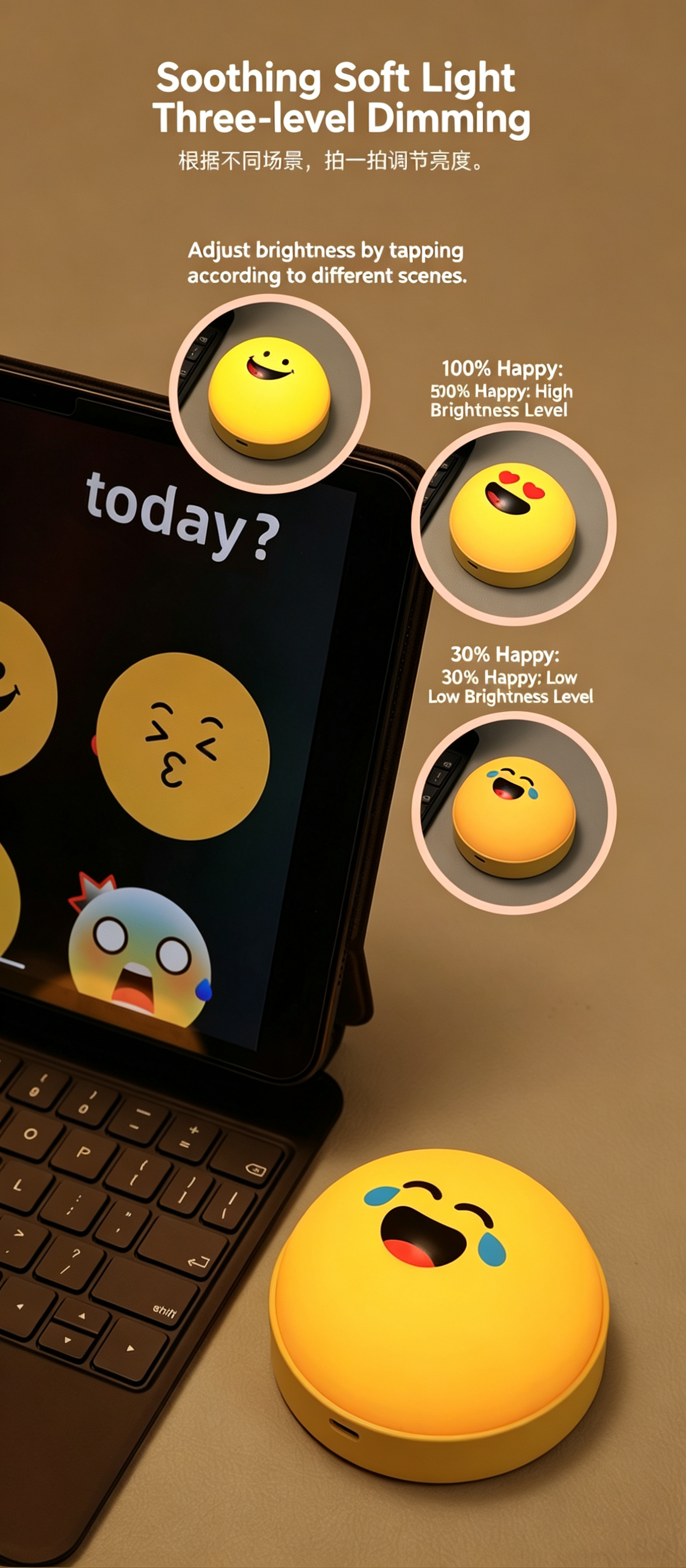 Smiley Emoji Night Light, Silicone Tap Control Bedside Lamp, Rechargeable RGB Ambient Light, Creative Kids Gift for Bedroom