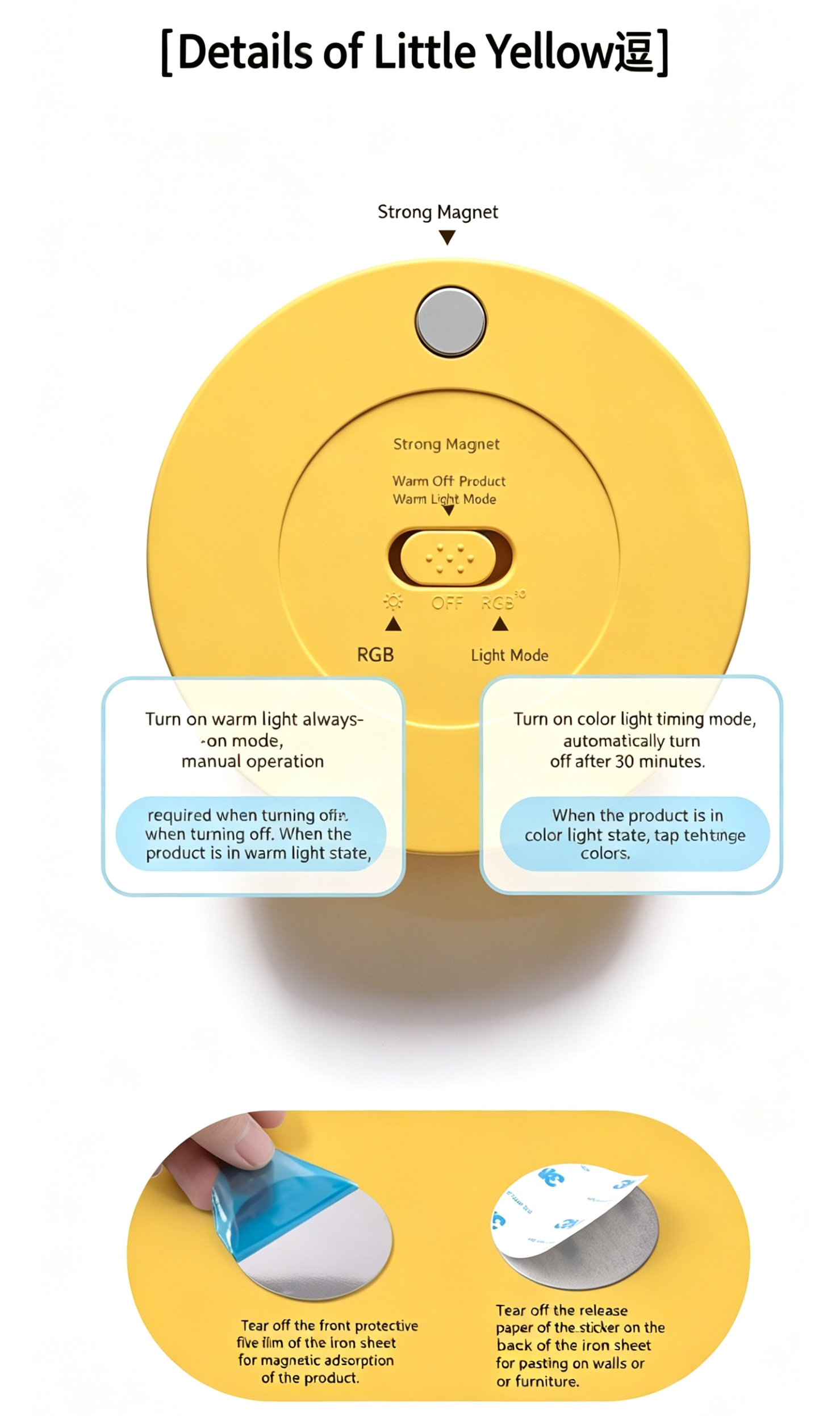Pat the light to switch modes: warm light (constant on, manual off), RGB color mode (30min auto-off), or power off. Adjust brightness or cycle colors with simple taps.