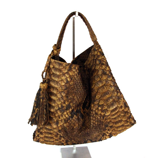 This exquisite handbag is made with exotic snakeskin and gives a noble golden-brown color. Featuring one single handle decorated with tassels of the same material, the handbag also impresses with a generous capacity. Smooth and sultry on the hands, this luxurious handbag is sure to burn up the fashion scene.