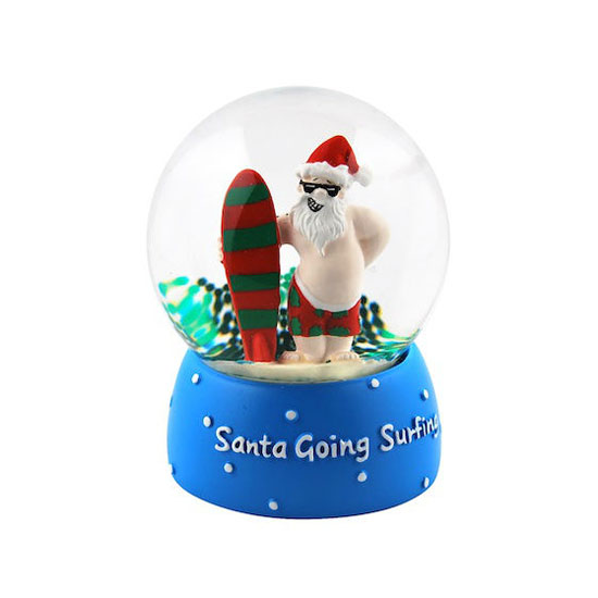 This snow globe encloses a miniaturized scene when Santa Claus is enjoying a sunbath and grabbing his surfboard. The snow globe comes with an outer-base with festive details. Shake the snow globe gently and make a wish when the "snow" falls.