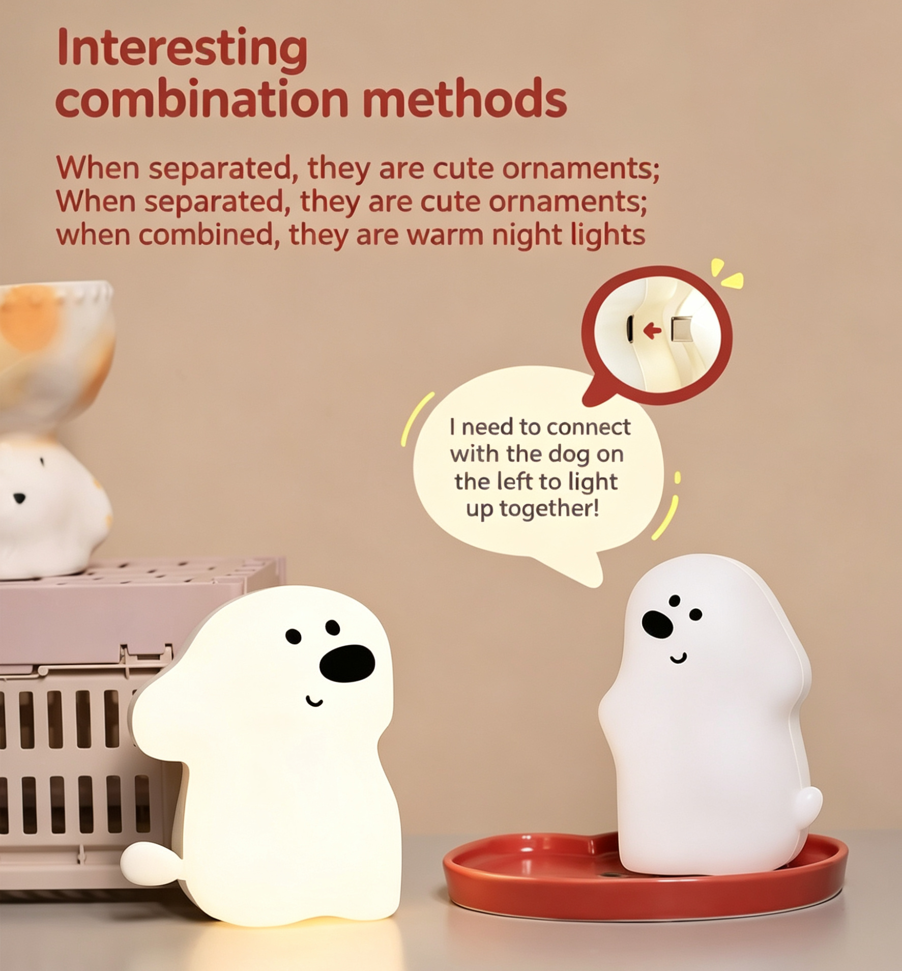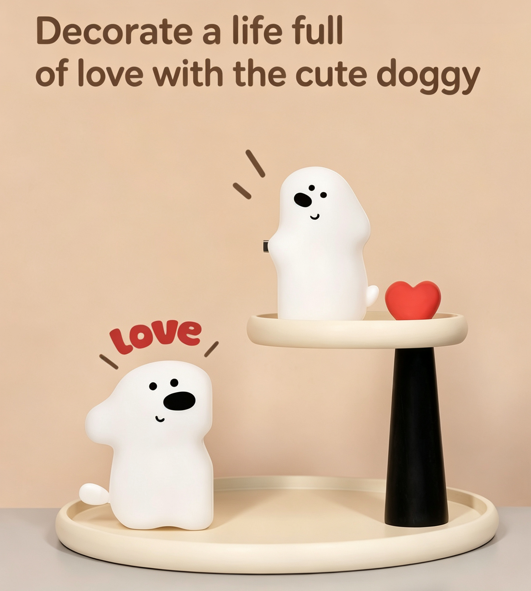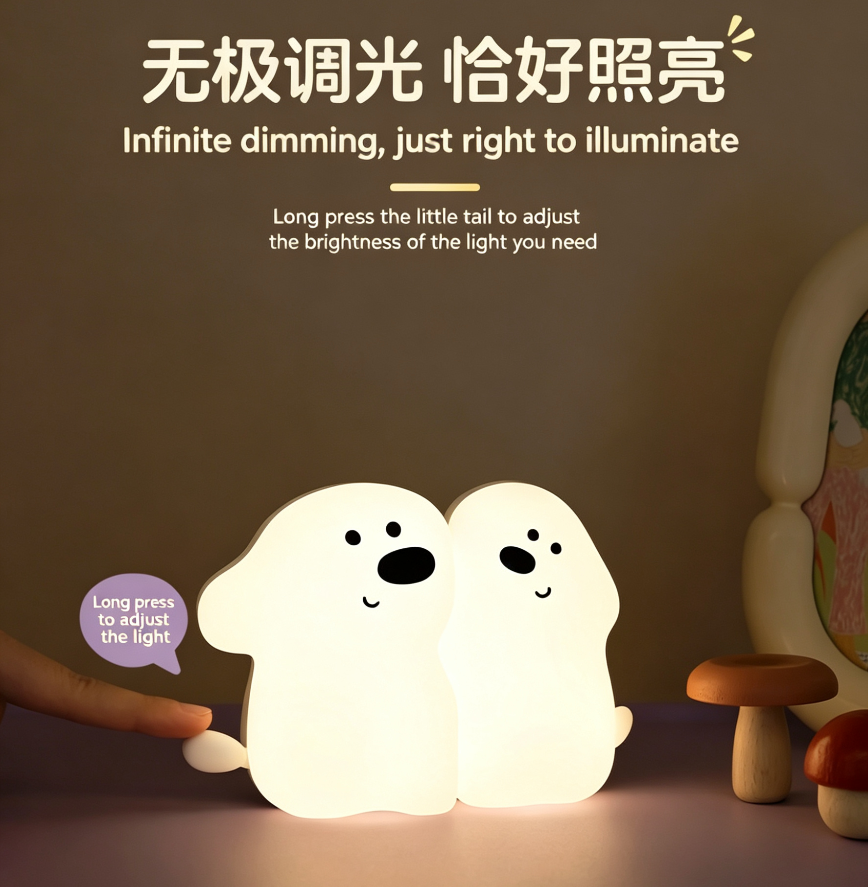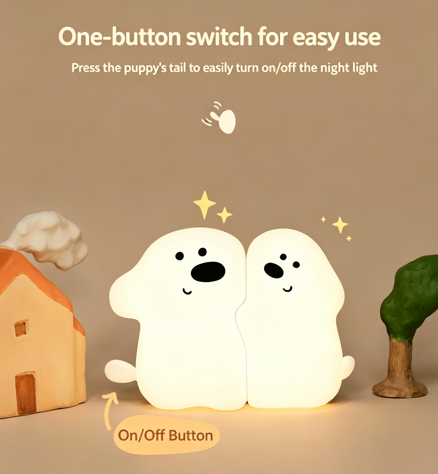 Press the puppy’s tail to turn on/off, long press to adjust brightness to your perfect level.
