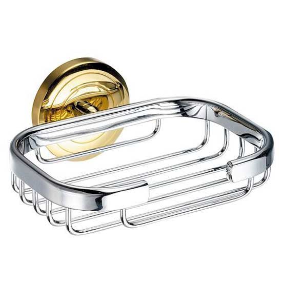 Featured is a brass soap basket with a fine chrome and gold finish. The sturdy construction ensures exceptional durability. This soap basket is suitable for households and hotels.