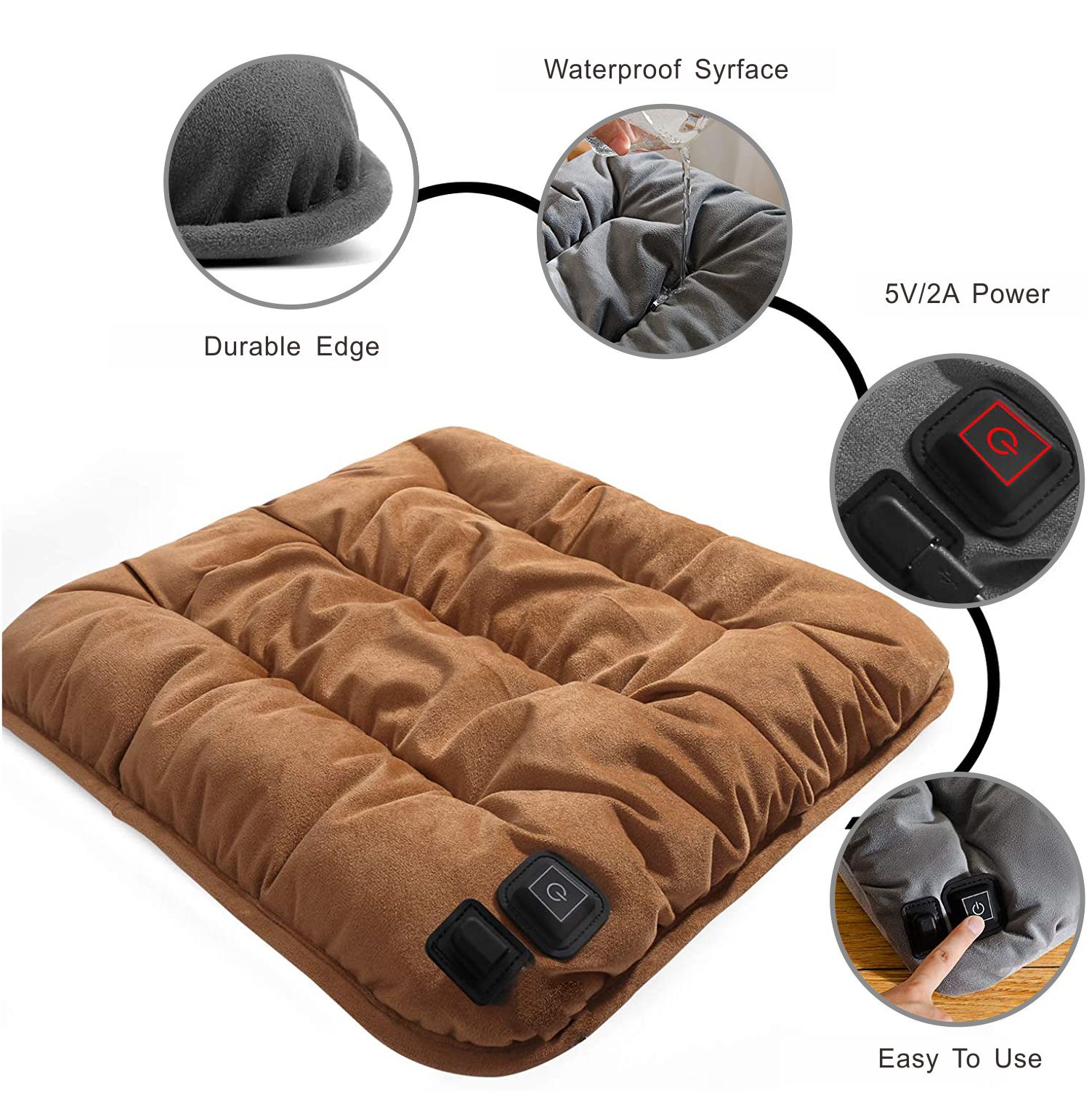 Safe& Reliable- The USB interface is easy to use. The connector is wear-resistant and durable, with built-in overheat, over voltage and short circuit protection modules and overtime power-off function. Each cushion is accompanied by an official power cable for fast heating. The USB connector can support 5V/2A: power bank, computer, socket, car USB as power supply.