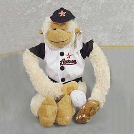 This soft plush gorilla is dressed in baseball costume. The baseball uniform is in black and white color featuring Astwg word mark and red star logo. The baseball cap which match the uniform is in black color with a red star logo. A mini stuffed baseball is attached on the stuff toy hand.