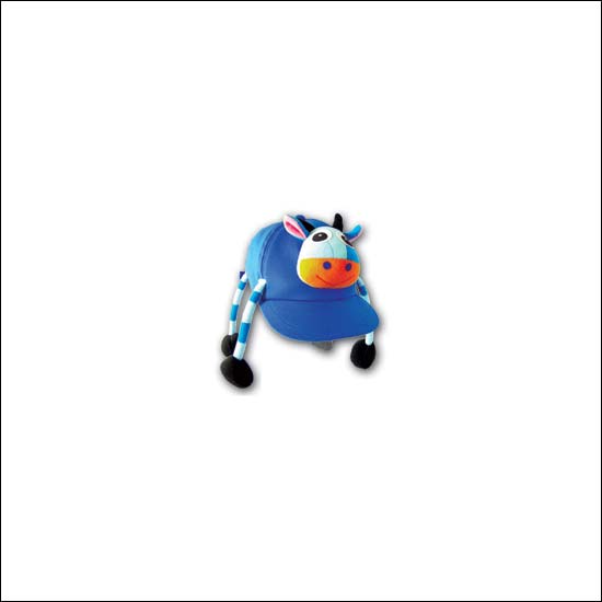 • It is a blue children cap with a soft toy cow.