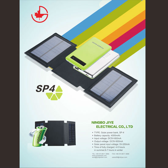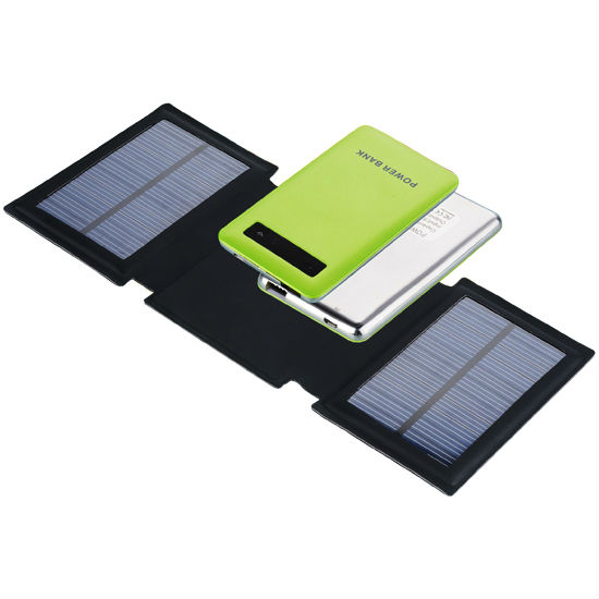 Outlined here is a fashionable and eco-friendly phone powerbank. It comes with a sleek white casing and a leather protection cover, accommodating a solar cell panel and a rectangular battery. The compact size and foldable design will allow great convenience.