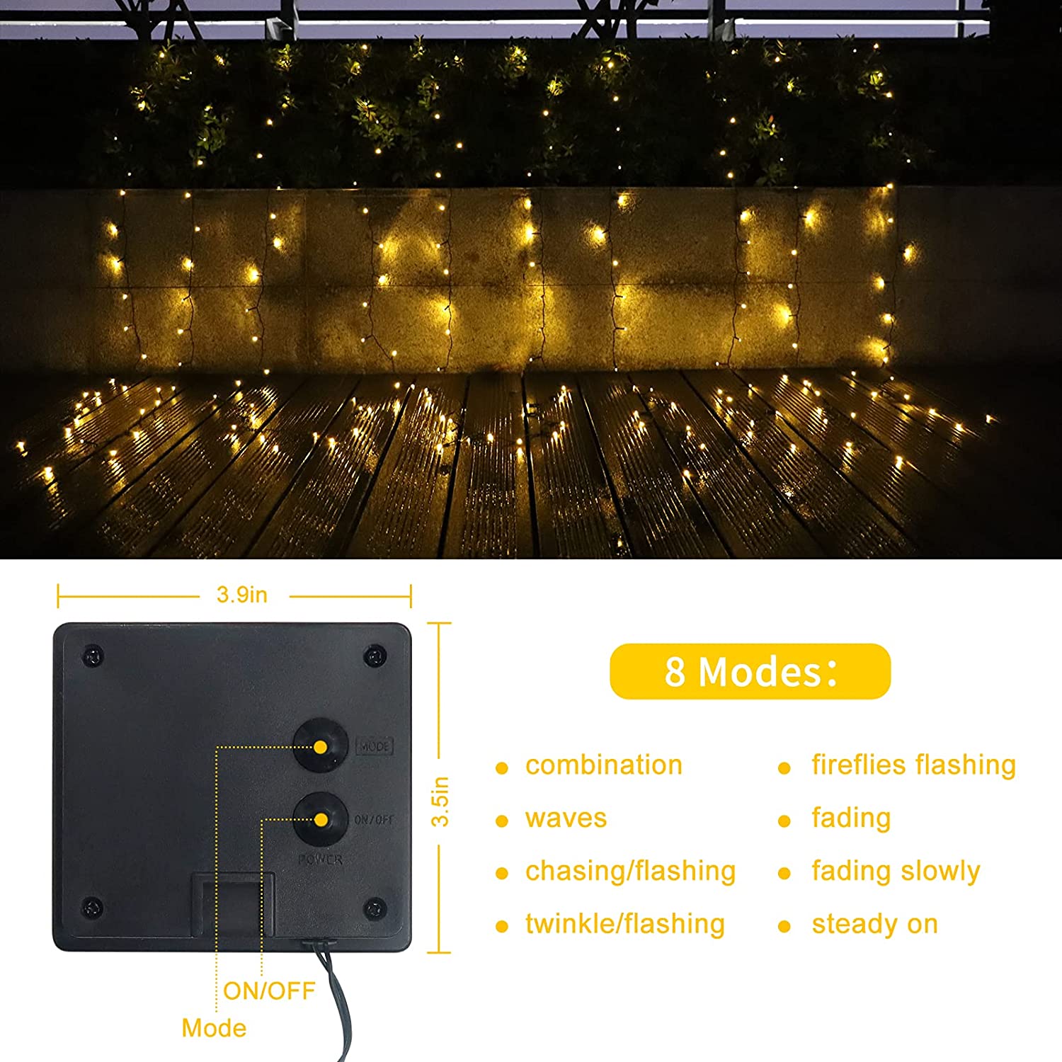 8 Lighting Modes - Gorgeous lighting modes including combination, fireflies flashing, waves, fading, chasing/flashing, fading slowly, twinkle/flashing and steady on. Lights auto on at night,auto off in daytime.Has Mode memory function,can remember your last mode setting choice