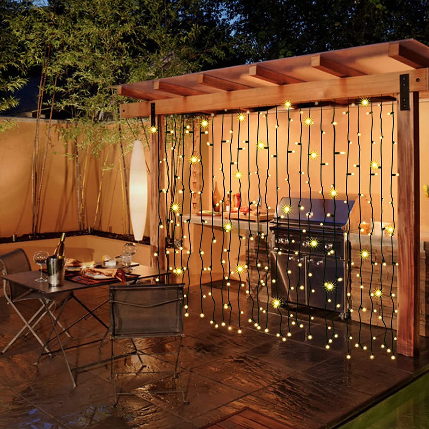 Good Size:6.6ft/2m x 6.6ft/2m,200LED -- 6.6ft(L) x 6.6ft(W),200 highlight LED, the lights can cover a large area which can create beautiful and warmful atmospheres for your life. Dark green cable can easy hide at night,more charming