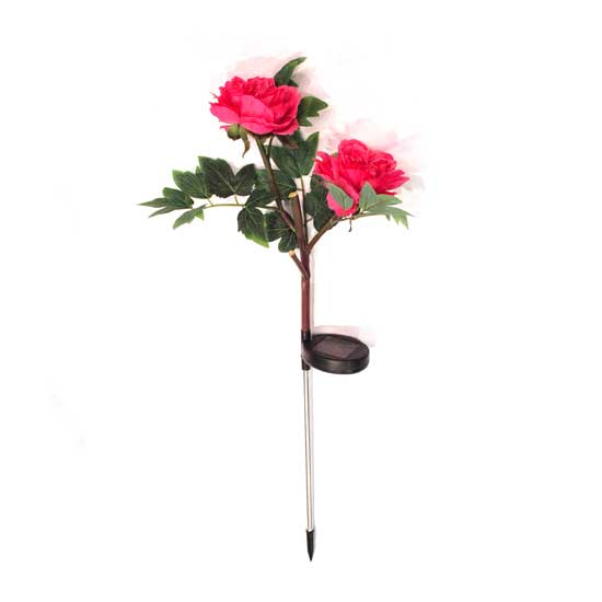 This solar flower lamp features the shape of a stalk of rose in pink. The spike bottom of the lamp allows users to insert it anywhere in your garden. A small solar panel is attached to provide free solar power to the lamp.