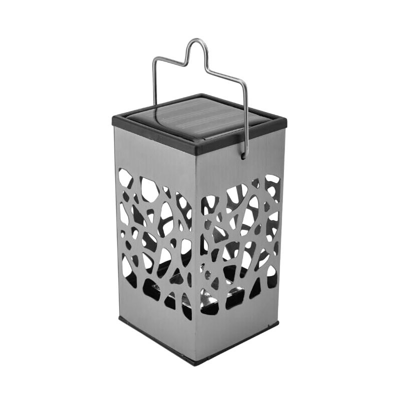 This solar lantern is made of stainless steel and has a white LED light source. It has a solar panel for power supply and comes with a handle on top for carrying and hanging. Adorned with elegant patterns on the exterior, this LED light delivers beautiful light effects and is great for decorative use.