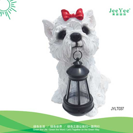 This is a solar light built with a crystalline solar panel. With a fun design, the lantern-shaped light is carried by a cute polyresin dog. The power switch is sensitive and easy to use.