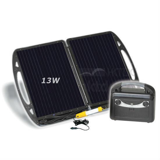 * Folding style 13Watt solar charger with briefcase design (More powerful 30Watt crystalline solar charger also available)