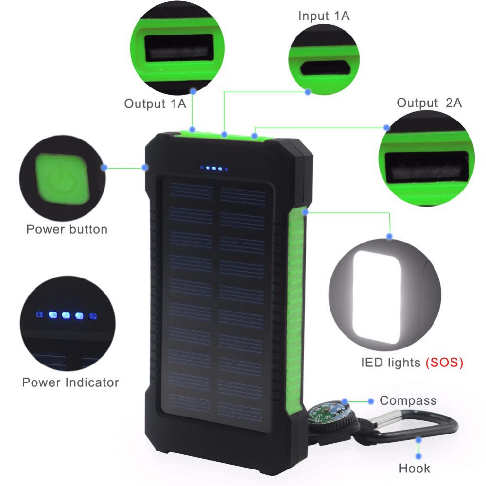 • Solar power bank, with waterproof cover,2 ports, can be 6000mah and 8000mah, also have led light and indicator