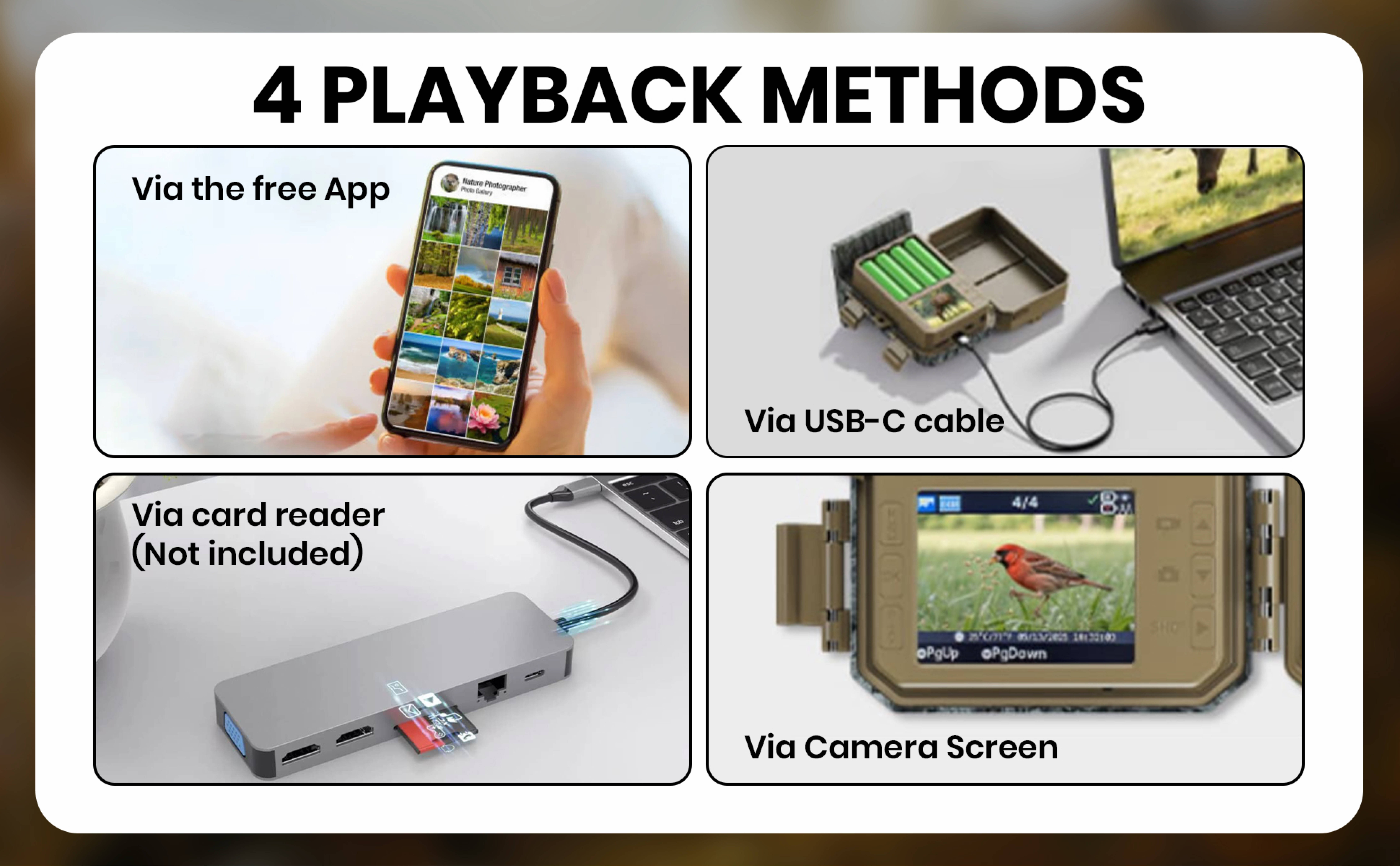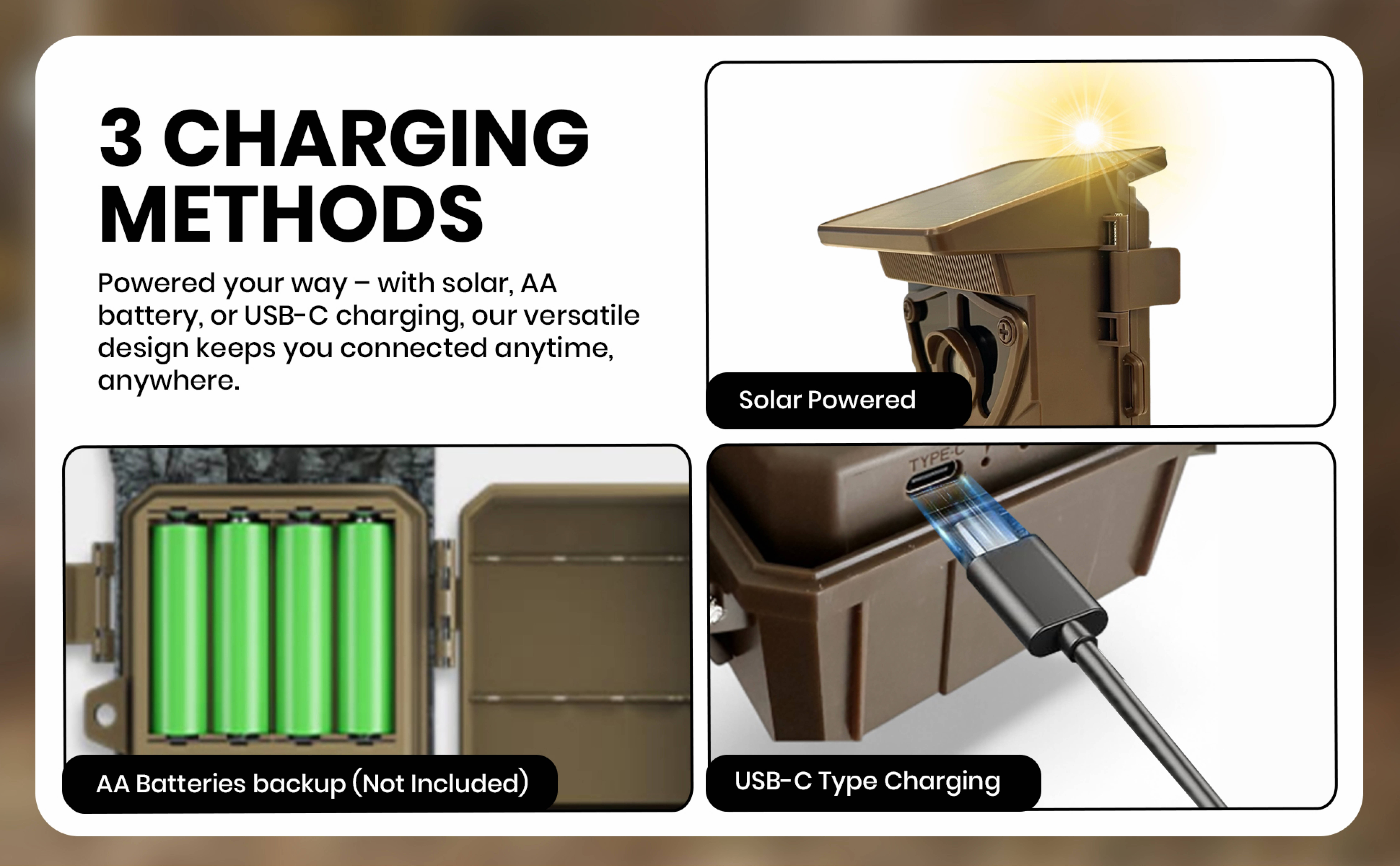 The camera has a built-in Wi-Fi and Bluetooth module, so that you can connect and operate the camera through a dedicated APP (“TrailCam Go”). The Bluetooth module, operating in low power, is used for device discovery, and Wi-Fi is used for preview, image transmission and settings.The Camera not only built inside rechargeable Li battery which can be charged by the solar panel and USB cable but also supports 4*AA batteries.Built the solar panel for power charging under the sunshine.