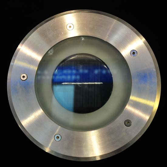 This solar underground light features a waterproof round-shaped housing. The aluminum construction guarantees reliable protection of the inner components. The solar panel exhibits efficient performance.