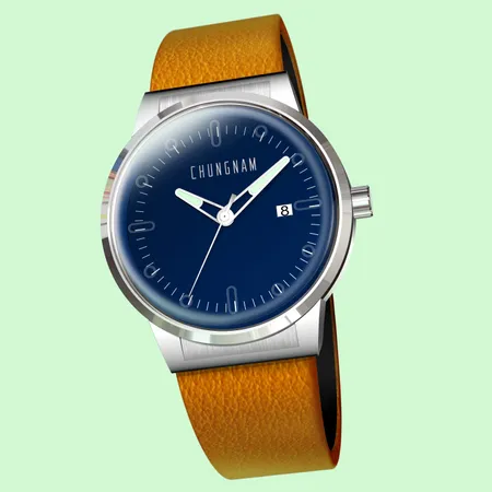 Japanese solar movement, 3 ATM water resistant, steel case and genuine leather strap.