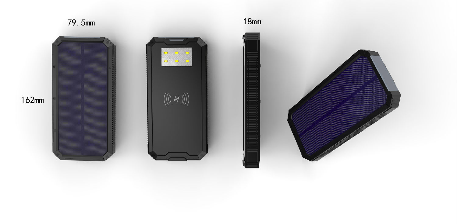 Material: ABS Product size:161.5*79*19.5mm Weight:277.5g Battery type:1260113 Li-polymer 10000mAh Micro input:5V/2A USB A output1/2: 5V/2A Wireless output:5W