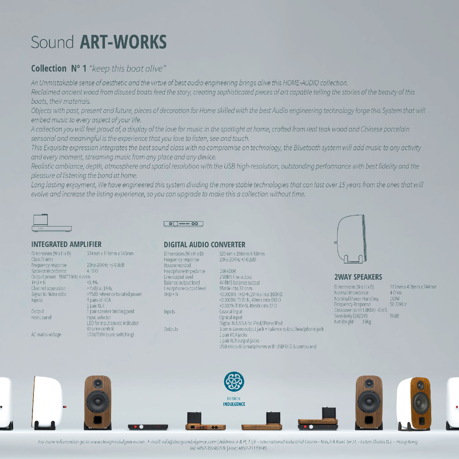 After the success in USA and Europe of this HOME-AUDIO Art and audio combined on an exquisite collection, an unmistakable sense of aesthetic excellence, intertwined with a set of frontrunners audio technology. An Amplifier, DAC and Speakers that will connect you with more than sound.