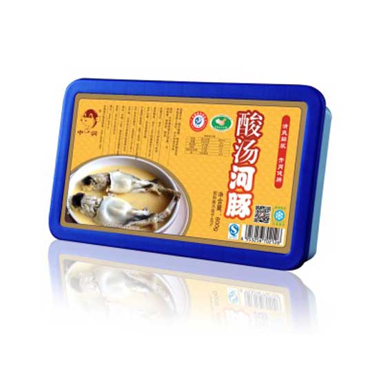 Displayed is a pack of sour soup pufferfish that is prepared with a unique recipe. Served in a mouthwatering soup, the pufferfish tastes even more tender and juicy. This high quality sour soup pufferfish can be easily prepared for your convenience.