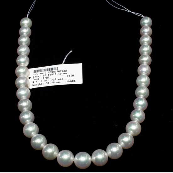 This strand of silvery white south sea pearls is characterized by charming luster and glow. The evenly sized pearls are ideal for different jewelry applications. The natural, unpretentious gemstones exhibit grace and elegance.