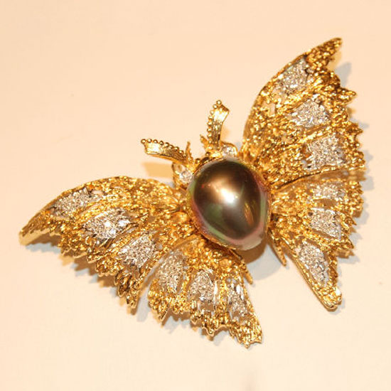 The Looking for Butterfly is an artistic masterpiece crafted with South Sea pearl, diamonds and 18k gold. The bronze South Sea pearl foregrounds the warm and vivid beauty of this brooch. The butterfly wings give warm glows that echo with the pearl.