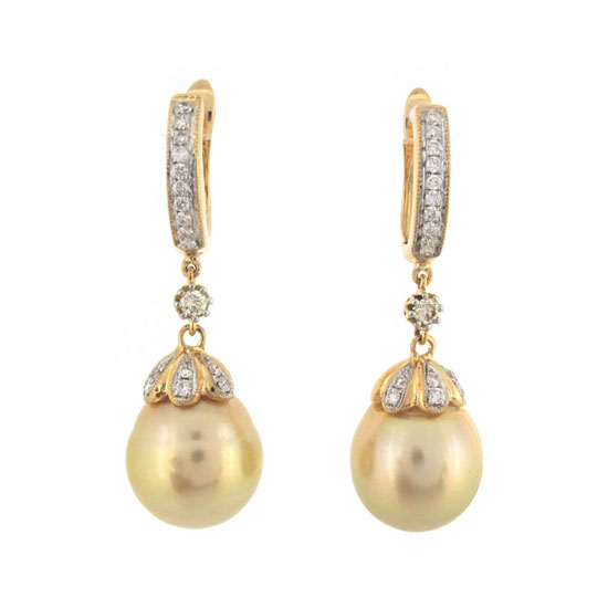 This pair of earrings is dazzling with the shiny finish of yellow gold and gloss of south sea pearls. The pearls are suspended like ripe fruit that are hung from branches. The added touch of luxuriousness is enhanced by decorative diamonds.