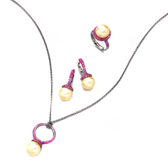 This is a set of South Sea pearl jewellery which expresses the concept "Simplicity is Beauty". The pink sapphire represents the beauty element of a woman. Where they are embedded surrounded stands out the Gold South Sea Pearl in the middle.