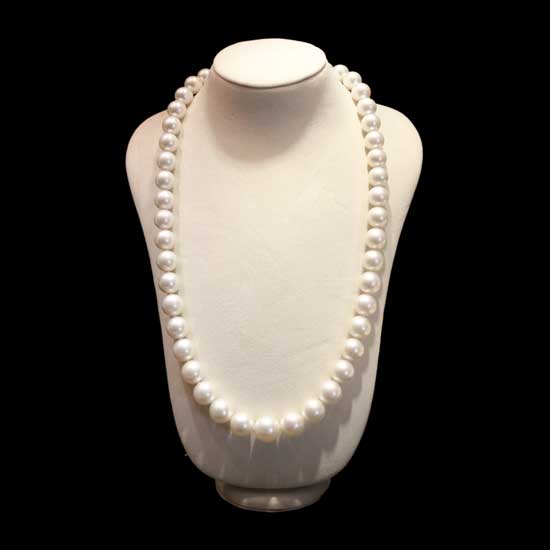 The necklace makes your eyes pop with huge South sea pearls stemming from Australia. Each of these pearls flaunts an ultra-sleek surface with an arresting surface shine. This necklace embraces your neck with ultimate glamor and luxuriousness.