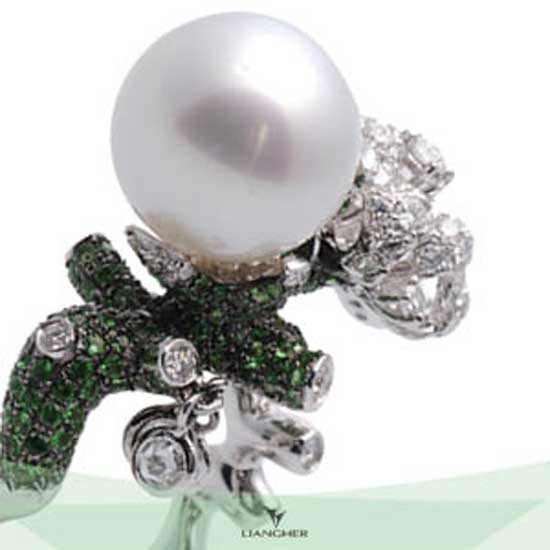 This ladies’ ring steals the spotlight immediately with its luminous white pearl. It features a branch design lavishly adorned with tsavorites and diamonds, airing an elegant touch. This alluring pearl ring is sure to glam up your fingers.