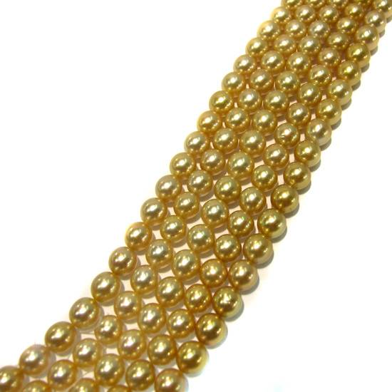These are strings of temporarily threaded South Sea pearls for making jewellery such as pearl necklaces. The pearls are round or near-round in shape and naturally gold in colour. They are suitable for mixing and matching with other pearls and gemstone beads as well.