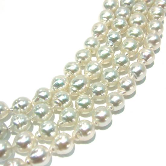These are strings of temporarily threaded South Sea pearls for making jewellery such as pearl necklace. The pearls have different semi-baroque shapes with rings and are naturally white in colour. They are suitable for mixing and matching with other pearls and gemstone beads as well.