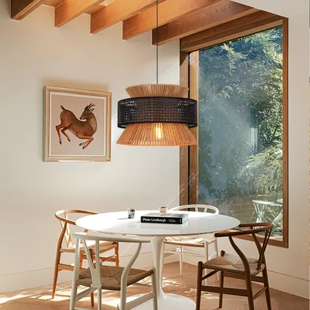 Transform your dining space into a whimsical retreat with this showstopping pendant light! It’s like a playful artisan twisted rattan’s earthy charm with sleek black woven flair into one stunning piece. When lit, warm glow filters through its textures, as if snagging sunbeams to dance across your table. The huge window frames a living green mural straight from nature. Toss in a book, a drink, and friends—your laughter’ll get coated in a toasty, golden hug from the light. This isn’t just a dining nook; it’s where nature, coziness, and tiny bursts of joy throw a never - dull party!