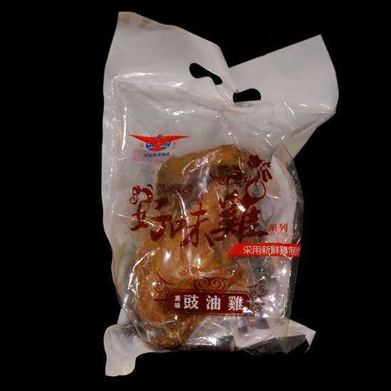Photographed is a whole cooked chicken marinated with soy sauce. The chicken is cooked wholly to ensure a more completed flavor. The soy sauce gets into the flesh and gives a mellow, luscious and additive taste in the mouth.