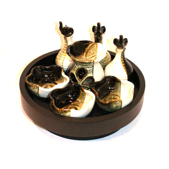 Presented here is a set of accessories that is designed for spa use. Assorted oil holders and a burner are included in this set of products. They are well made of ceramic material for withstanding high temperatures.