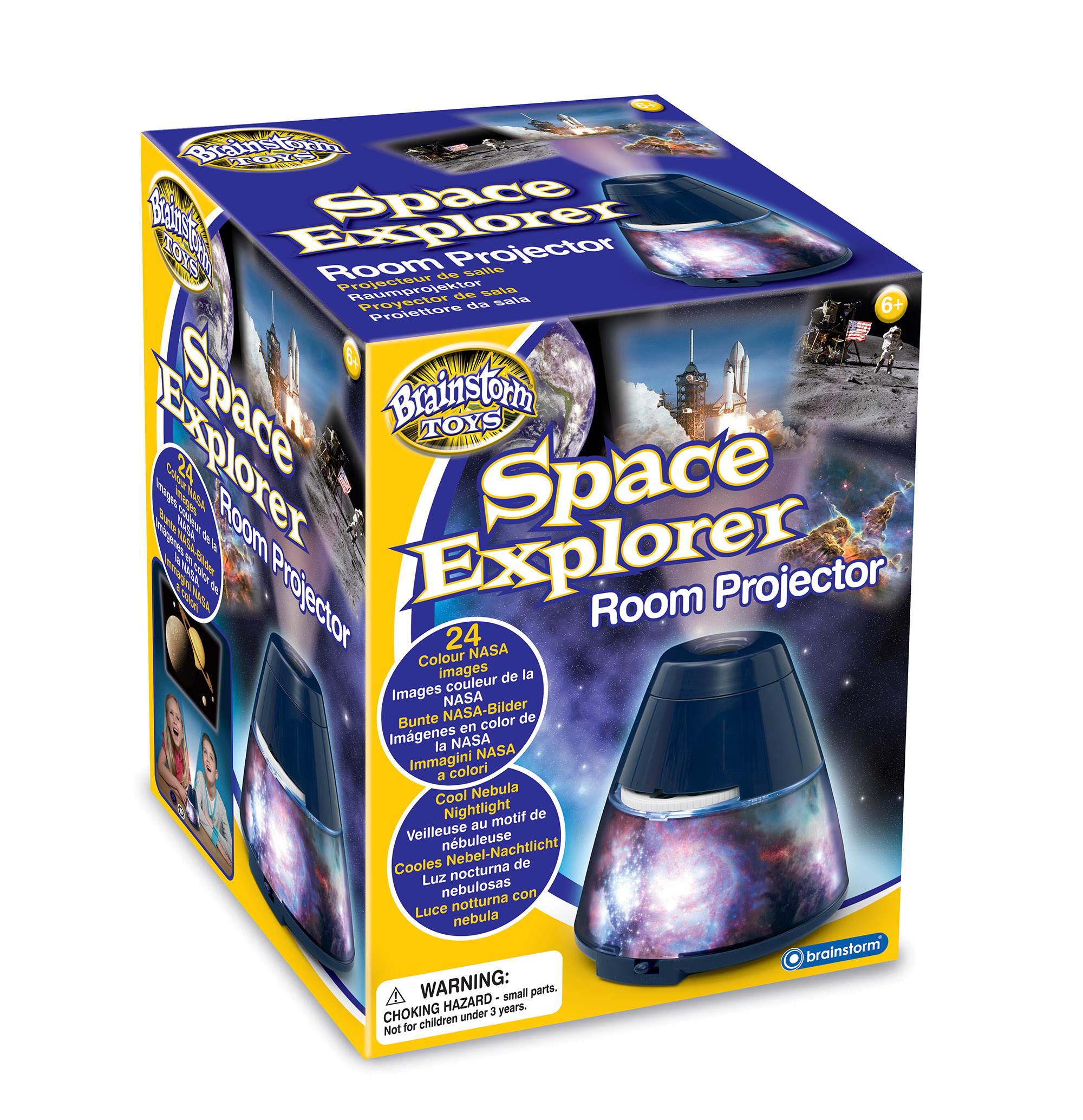 Explore the universe with this high quality projector. View 24 colour NASA and Hubble Spacecraft telescope photographs of spacecraft, astronauts, planets and nebulae, from three changeable slide discs. Easy to use, just turn the switch to projector mode and insert one of the three picture slides, rotate the slide round to view the 24 different photographs that project on to the ceiling up to one meter wide. To change the slides simply press the button on the side of the projector to release. At night Space Explorer becomes a cool nebula night light by turning the switch to the lamp mode. Read fascinating information about each NASA photograph. High quality projection creates a window into space.