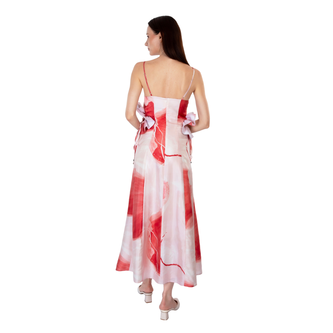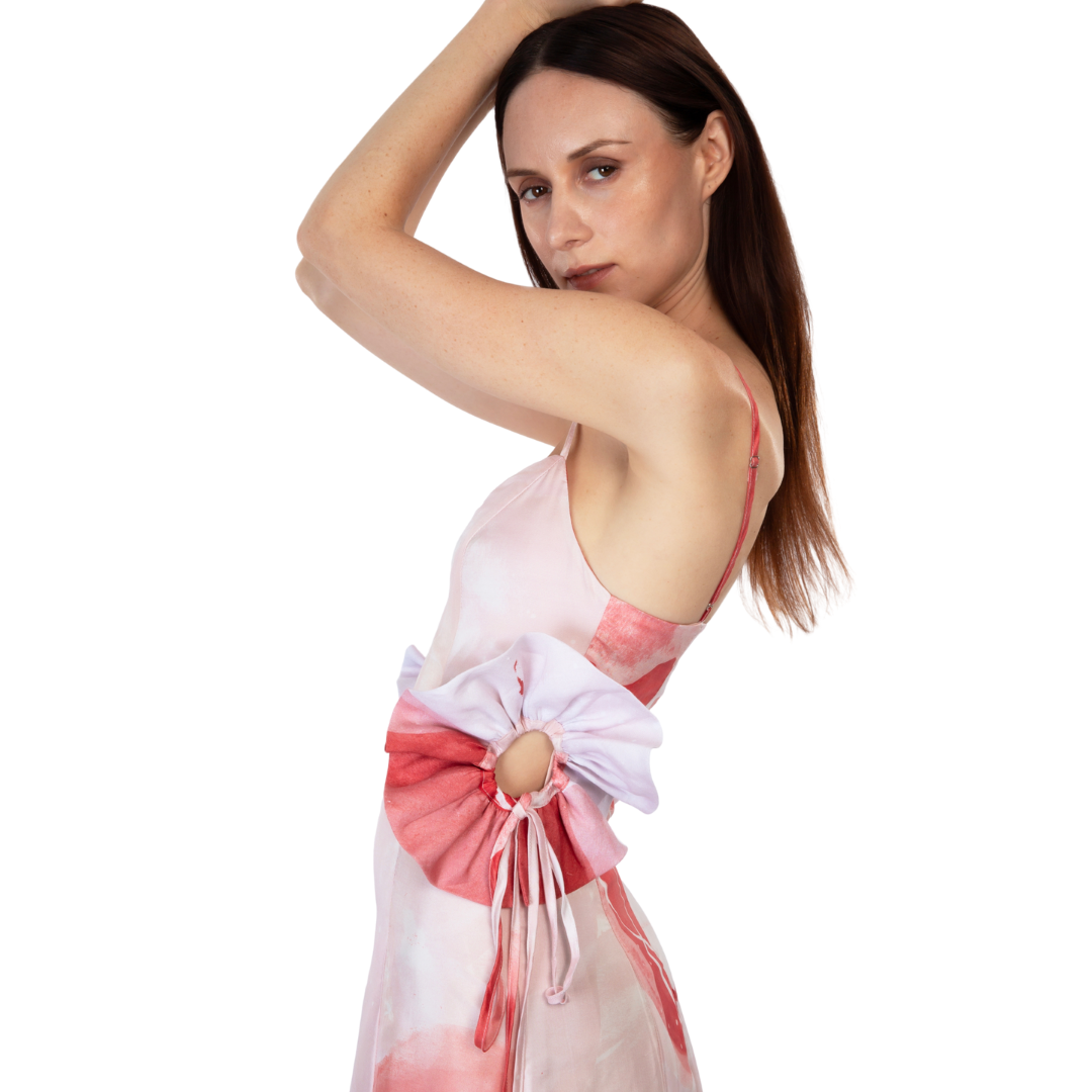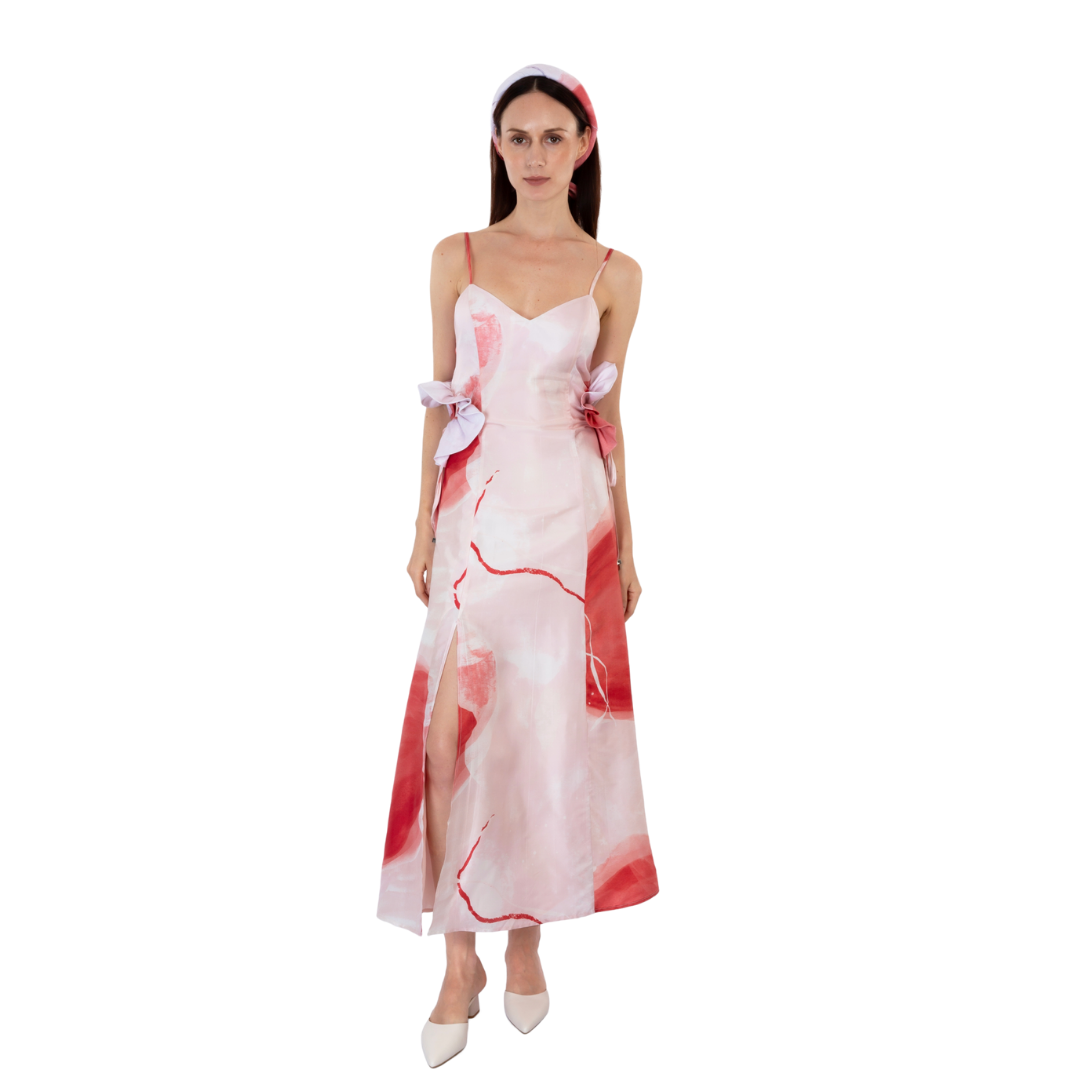This enchanting maxi dress showcases our signature watercolor print, featuring an artfully placed moderate slit that adds movement and elegance. The design combines timeless sophistication with modern comfort, making it perfect for special occasions.