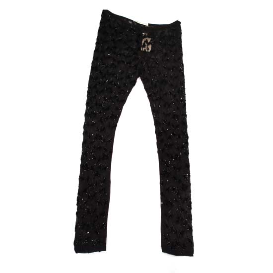 This pair of spandex leggings exhibits a unique design. The tubes feature thread embroidery and velvet applique, creating a mysterious yet classy style. The patterned patch on the front showcases added specialty.
