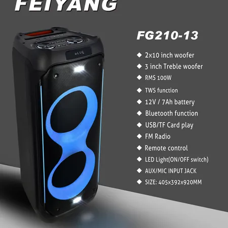 Record/12V , 7Ah lead acid battery /AUX Input /Light on woofer / EQ/ 2 Mic input/Guitar input / English Voice broadcast/ 12V/wheels /RMS:100W