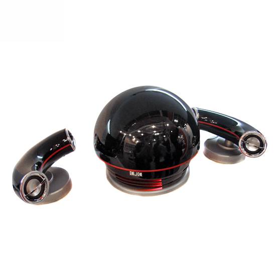 The featured items are a set of speakers to go with hi-fi equipment. They come in a unique design with the main speaker in a black ball shape and the side speakers in the form of two curly bars.