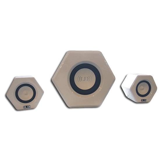 The featured item is a set of speakers. They come in a special hexagon shape with a glossy finish. The set includes 3 speakers in total, a larger main speaker and 2 side speakers.