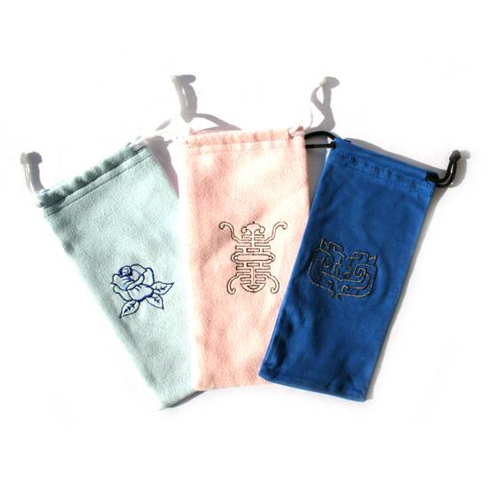 A selection of spectacle bags with drawstring design. Available in three colours of pink, blue and light blue. Designed with fancy embroidery on the front as decoration.