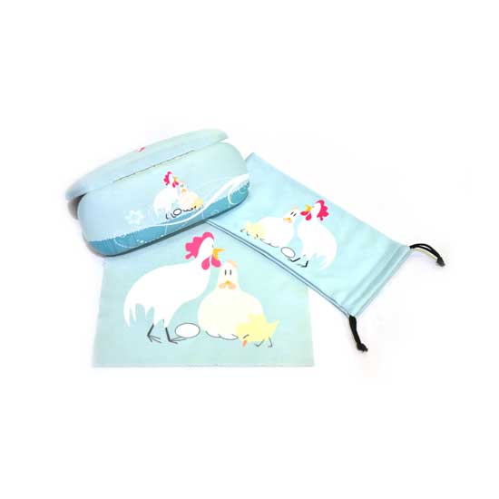 This is a set of eyewear accessories with a lovely cartoon chicken-themed design. A matching spectacle case, spectacle pouch and spectacle cleaning cloth are included in this eyewear accessory set. Well made of microfiber, they are non-scratching and non-lining.