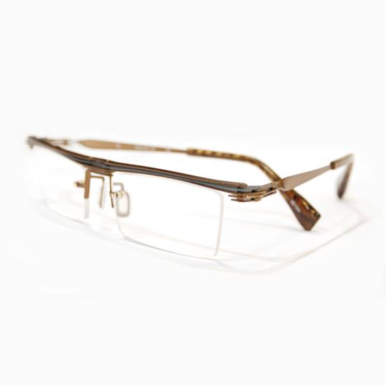 This is a pair of spectacles with brown coloured spectacle frame. The spectacle frame is decorated with coloured metal sticks and is equipped with transparent nose pieces.