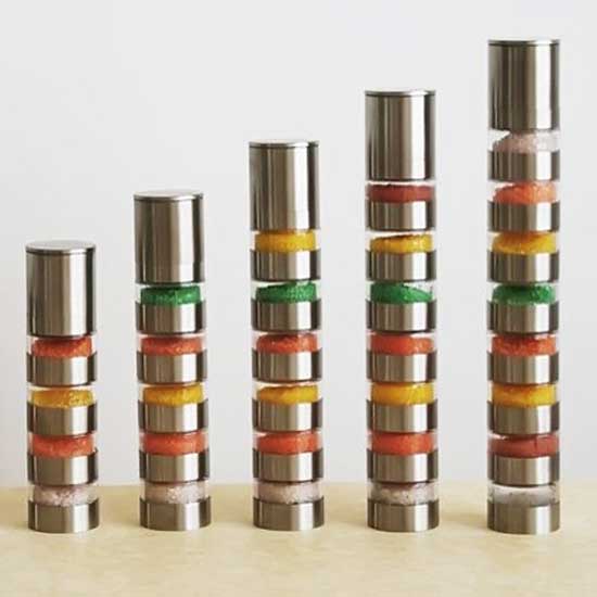 Highlighted is a spice mill in an impressive and innovative design. It comes with layers of compartments for spices, pepper, salt and more. The alternate glass and matt-finished housing showcases an appealing style. Save space with this excellent spice mill.