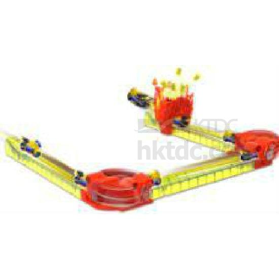 The Spin-Go Swerve and Shoot Off Track Set included 2 Spin-Go 6GEN + 2 Slopes + 2 Direction Change Devices + 3 Straights + 1 Ejection Devices + 3 Cones + 3 Pots + 4 Stand On Wall + 4 3M Glue + 1 Poster On Wall + 1 Manual.
